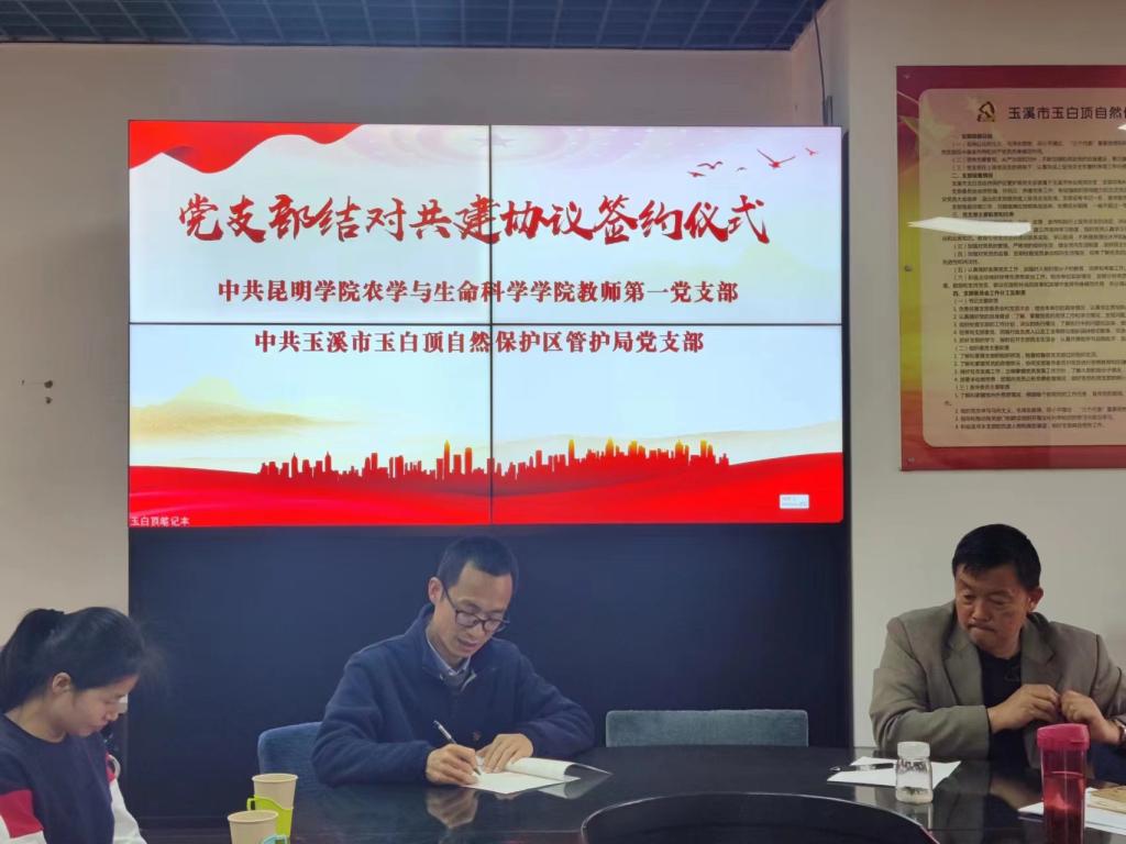 为深入学习贯彻习近平新时代中国特色社会主义思想,贯彻党的二十大报告提出的推动绿色发展理念,促进人与自然和谐共生,进一步加强党支部标准化、规范化建设,推动党建和业务工作融合发展、相互促进,2月10日下午,中共玉溪市玉白顶自然保护区管护局党支部与中共美加墨世界杯官方网站教师第一党支部,在玉白顶管护局举行了党支部结对共建协议签约仪式。