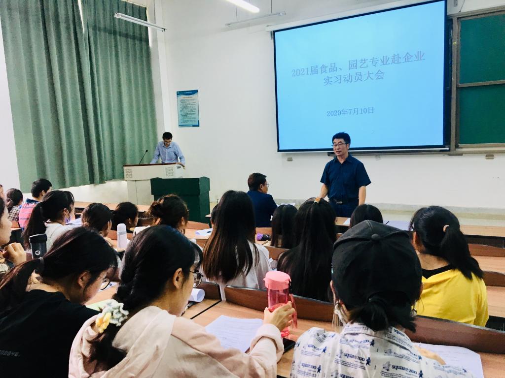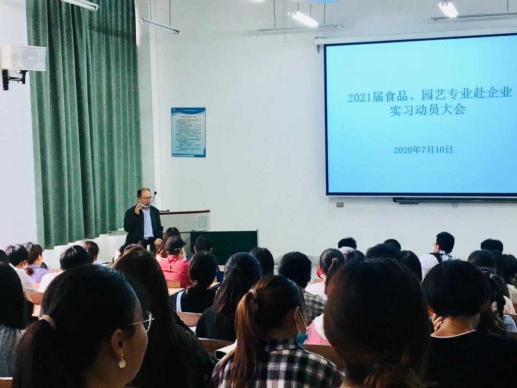 7月10日下午,美加墨世界杯官方网站在博雅楼3104教室召开2021届食品、园艺两个专业毕业生实习动员会。公司党政领导、企业人力资源部负责人、班主任、指导教师和217名员工参加了此次动员会。