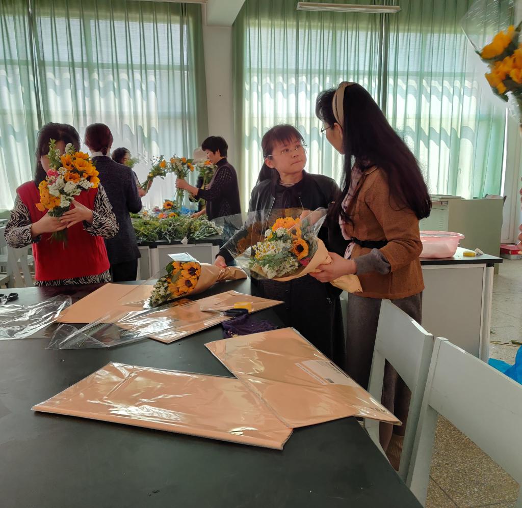 在农学楼1407花艺室,老师们精心挑选着自己喜欢的花材,跟着花艺老师耐心的学习插花作品制作,耐心地跟着制作步骤,相互关注着、探讨着、询问着认真学习与创作,面对完成的作品,老师们脸上洋溢着春的气息和成功的喜悦。